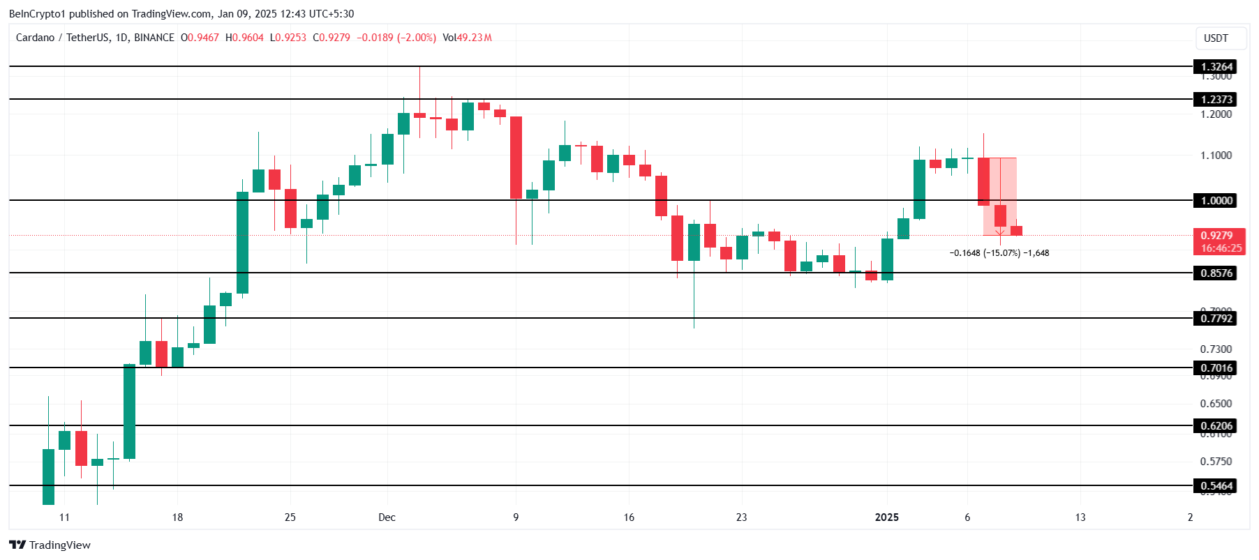Cardano har møtt betydelig nedadgående press, med prisen som har falt med 15 % de siste 48 timene. Altcoinen klarte ikke å opprettholde $ 1,00 som støttenivå, og falt under dette kritiske nivået.