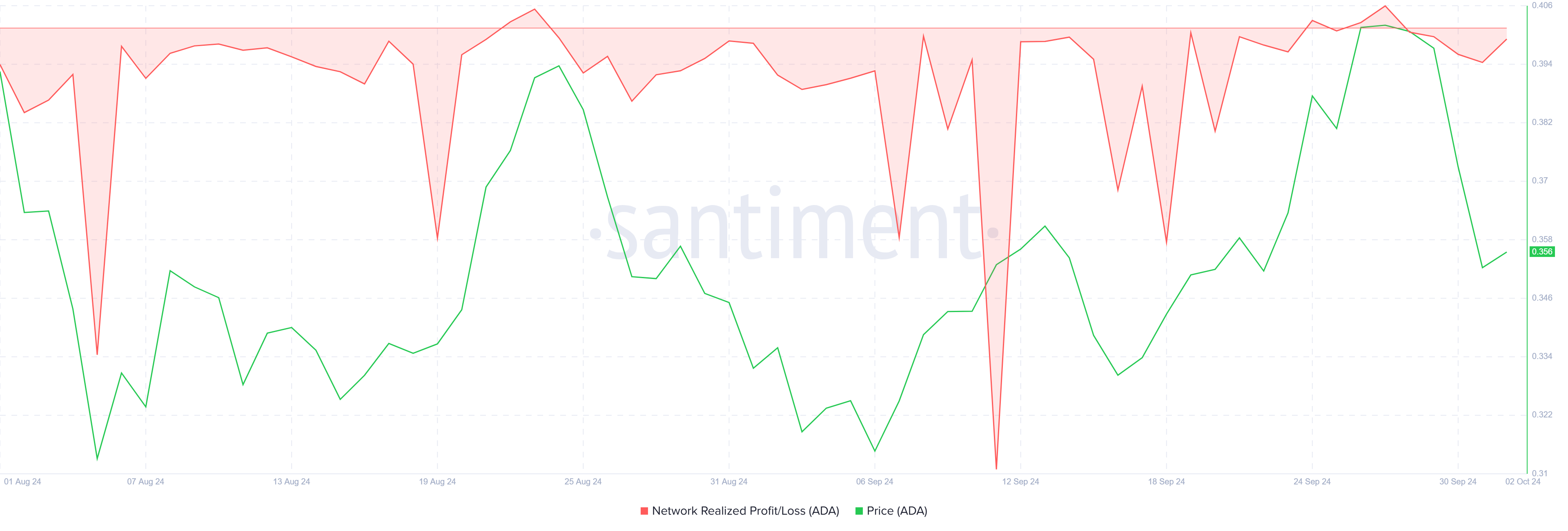 Til tross for det nylige fallet på 11 %, antyder Cardanos realiserte fortjeneste/tap-indikator at investorene forblir rolige. Mangelen på betydelige topper i indikatoren signaliserer et lavt nivå av panikksalg.