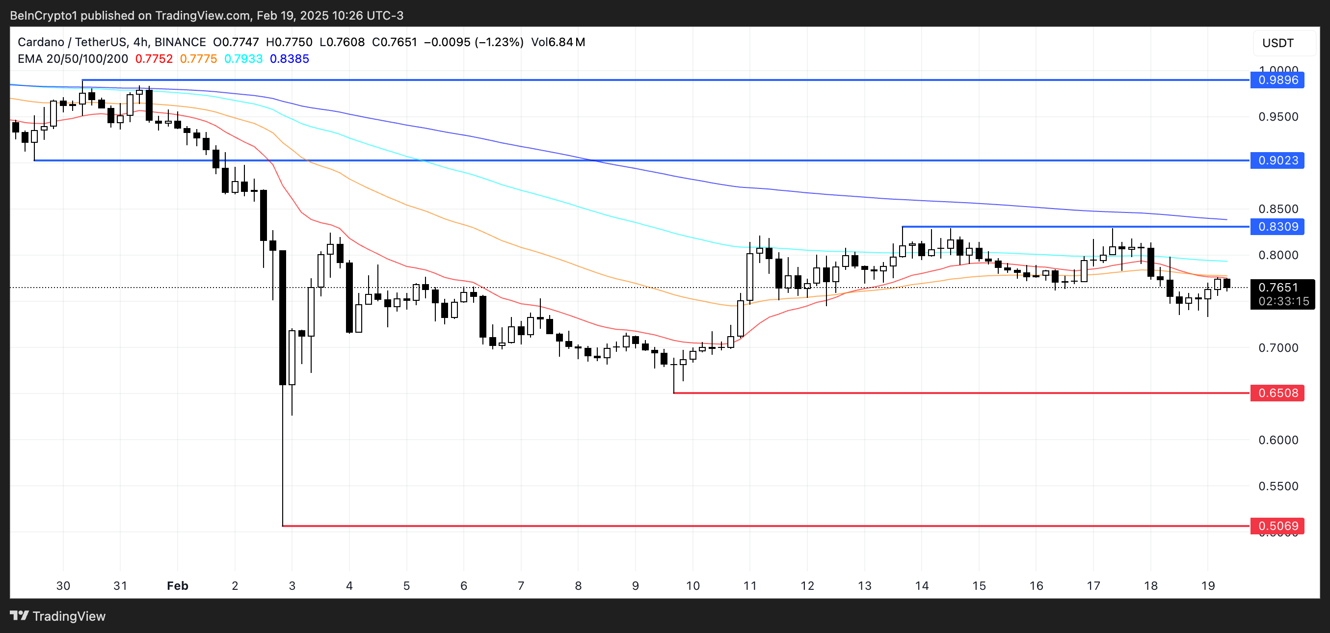 Cardano handles for øyeblikket innenfor et definert område, med motstand på $ 0,83 og støtte på $ 0,65.