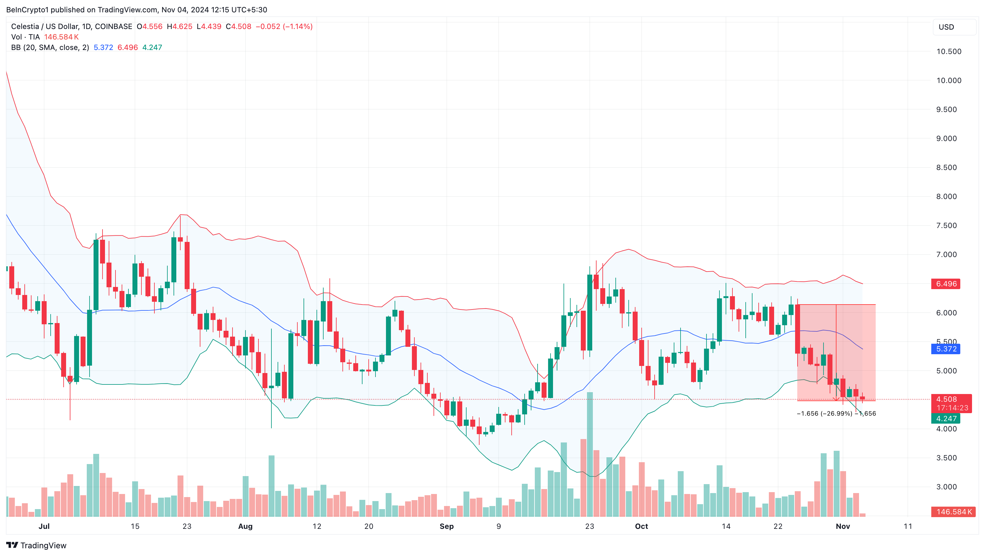 Celestias (TIA) kurs har falt med omtrent 27 % siden 25. oktober. I løpet av denne perioden falt altcoinen fra $ 6.16 til $ 4.50, og slettet alle gevinster TIA hadde i september.