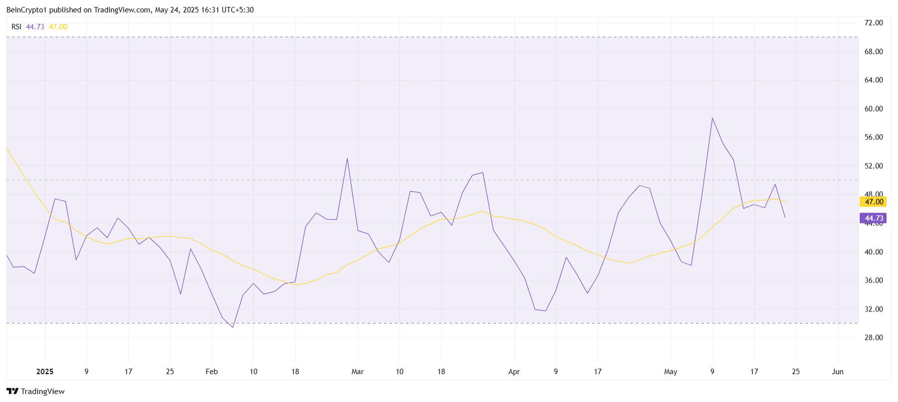 Relative Strength Index (RSI) steg kortvarig inn i bullish territorium, men har siden trukket seg tilbake under det nøytrale 50-nivået. Dette mønsteret peker på skjør bullish momentum, sannsynligvis hemmet av salgspress eller eksterne markedsusikkerheter.