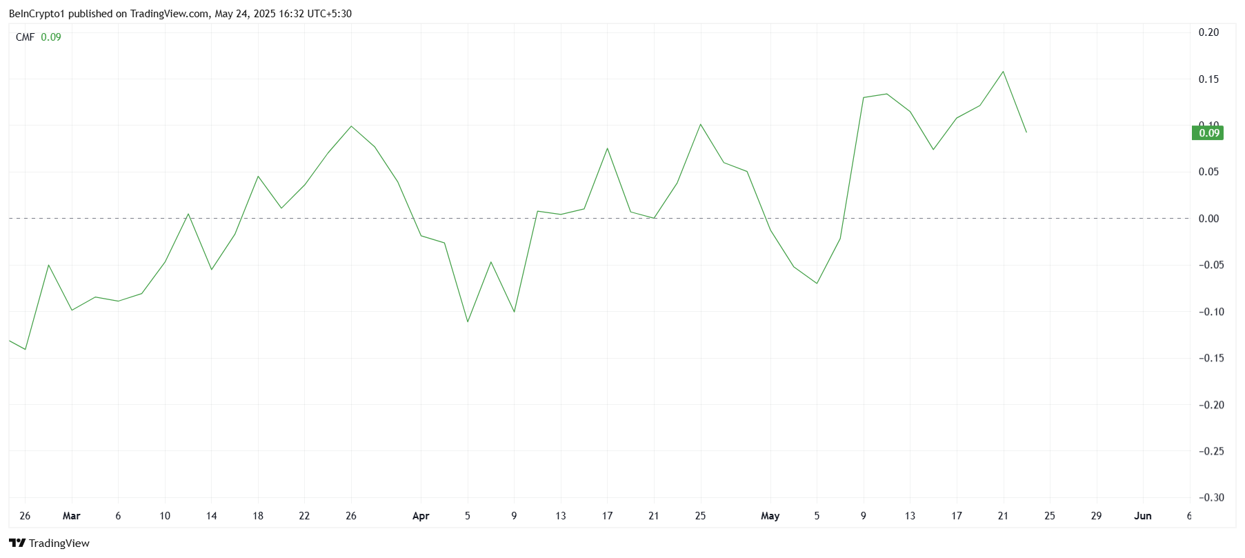 Chaikin Money Flow (CMF)-indikatoren har vist en beskjeden økning nylig, men ligger fortsatt like under null. Dette antyder at selv om kapitalinnstrømninger er til stede, er den generelle investortilliten forsiktig.