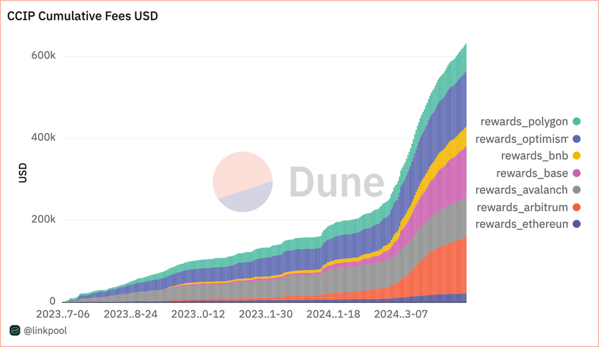 Videre har introduksjonen av nye funksjoner som Transporter – en brobyggende applikasjon – og forbedrede tokenoverføringsfunksjoner drevet CCIPs vekst. Allerede i første kvartal 2024 så protokollen en økning på mer enn 900 % i transaksjoner på tvers av kjeder og en bemerkelsesverdig økning på 4000 % i overføringsvolum sammenlignet med forrige kvartal.