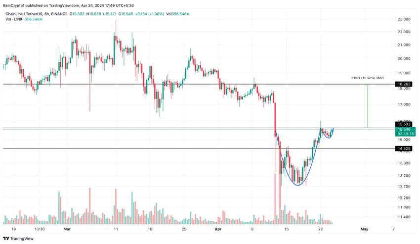 For en vellykket reversering må LINK bryte gjennom halslinjen på 15,63 dollar. Hvis LINK opprettholder dette bruddet, kan aksjen stige med omtrent 17 % til $ 18,26.