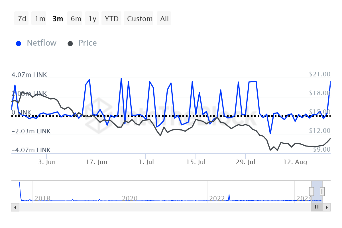 Lommebøkene som holder minst 0,1 % av det totale sirkulerende tilbudet av LINK la til over 3,4 millioner LINK på bare to dager. Denne $ 40 millioner økningen i strømmer har økt de totale infløder fra 256 000 LINK til 3,71 millioner LINK. Det indikerer at den nylige prisstigningen har vekket fornyet tillit blant investorene.