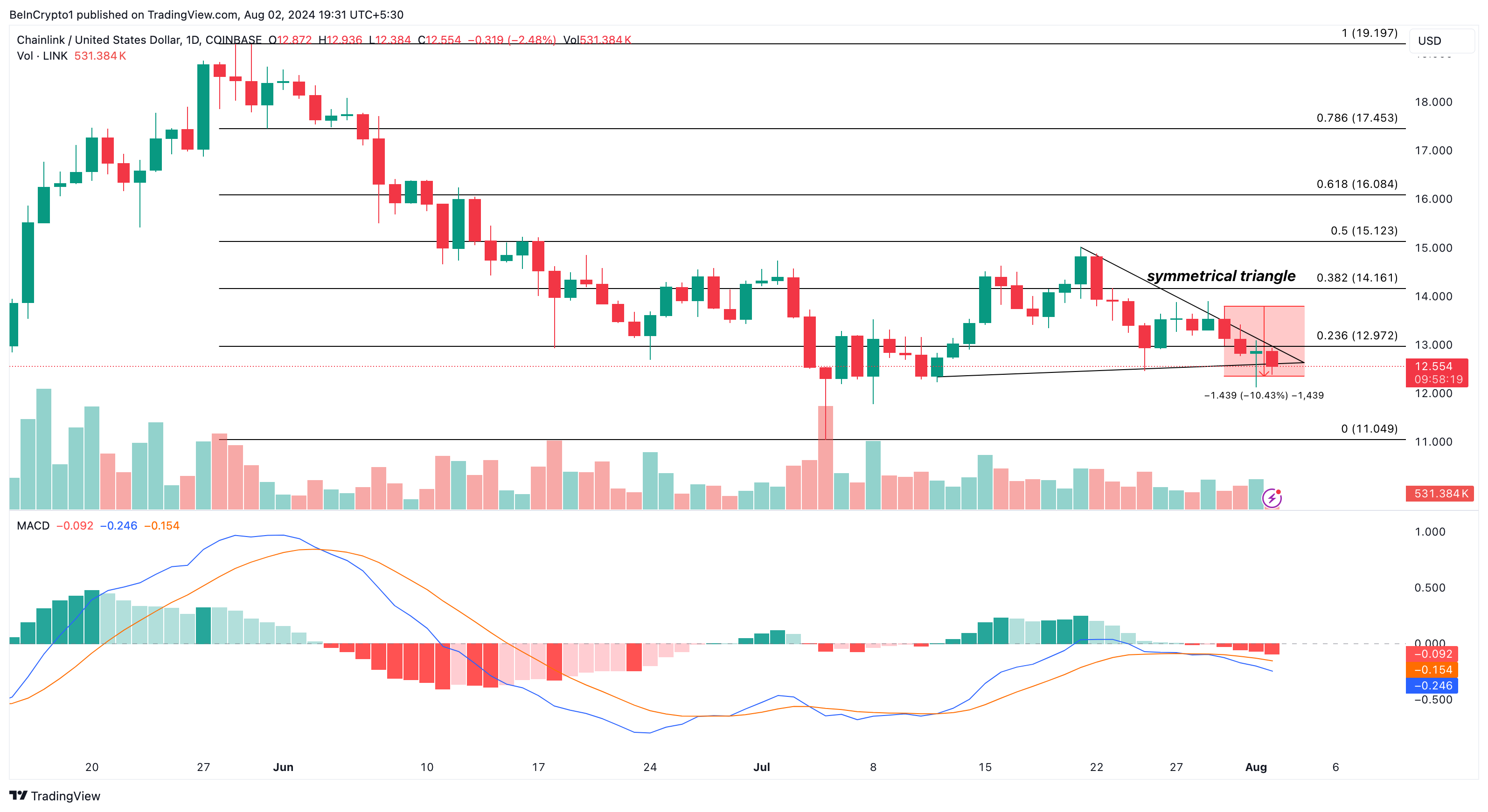 Til $12,65 handles LINK innenfor en symmetrisk trekant på det daglige diagrammet. Dette mønsteret dannes vanligvis når to trendlinjer som forbinder en serie høyder og lavpunkter konvergerer. Det indikerer ofte en pause i den rådende trenden før den til slutt gjenopptas.