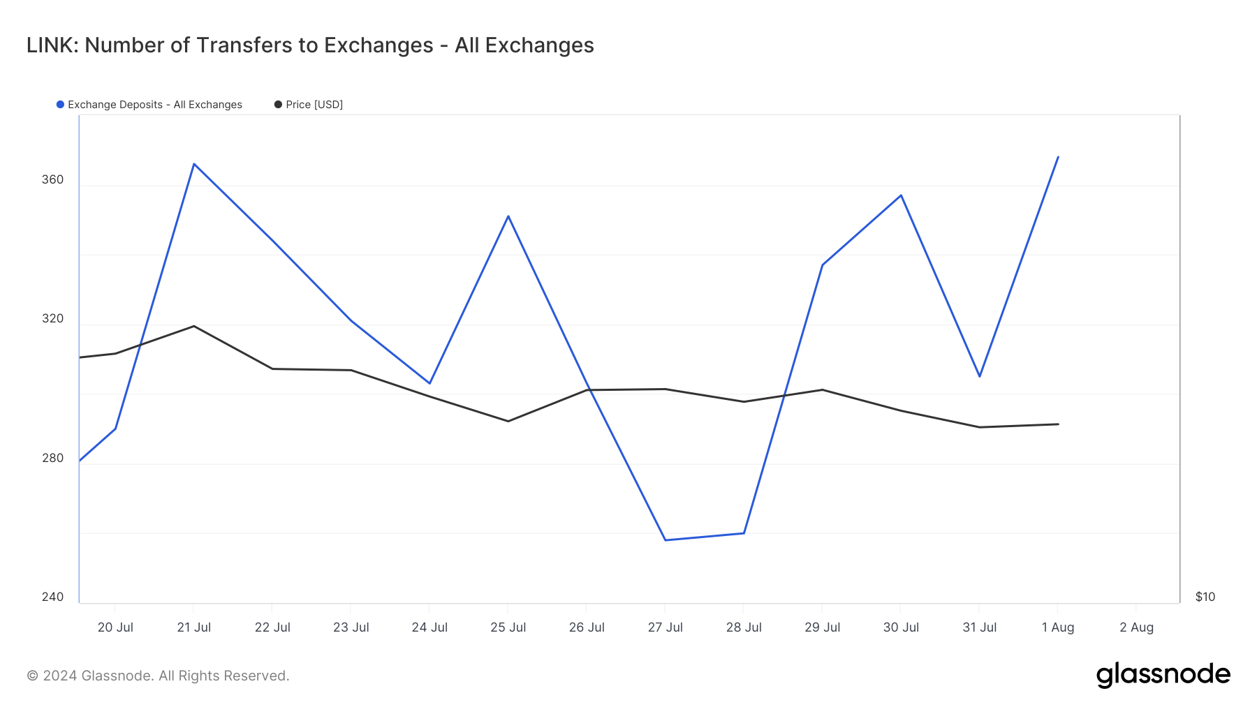 I tillegg viser data fra Glassnode en økning i antall LINK-tokens sendt til børser. Når innskudd på børs øker, betyr det at markedsdeltakere er villige til å selge.