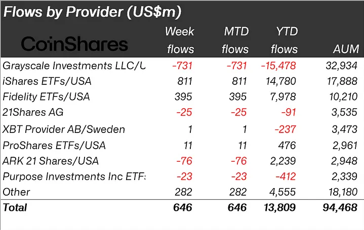Tidspunktet stemmer overens med en rapport fra CoinShares som viser “tegn på at ETF-hypen er i ferd med å avta”. I forrige uke utgjorde tilstrømningen av investeringsprodukter for digitale aktiva, inkludert USA-godkjente Bitcoin ETF-er, bare 646 millioner dollar. Dette tallet gjenspeiler en nedgang fra 862 millioner dollar to uker tidligere.