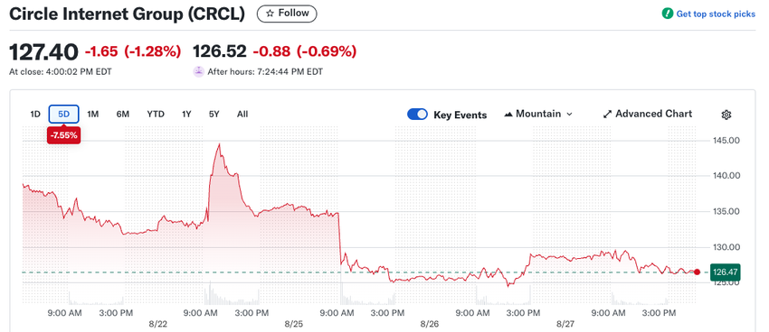 Samme dag stengte Circle (CRCL) aksjer på $ 127,4, ned 1,28 % fra forrige økt. Nedgangen kom midt i en bredere markedsnedgang, med Bitcoin som falt 0,7 % over 24 timer til $ 111 277 og Ethereum som falt 2,2 % til $ 4 511.