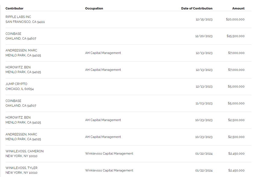 Før Coinbase donerte også Ripple og risikokapitalfirmaet a16z til Fairshake. Andre givere inkluderer Geminis Winklevoss-tvillinger, Jump Crypto og Union Square Ventures. En rapport fra Public Citizen fant at Super PAC-er tilknyttet digitale eiendeler, inkludert Fairshake, samlet inn det tredje høyeste beløpet av alle super PAC-er før valget i 2024.