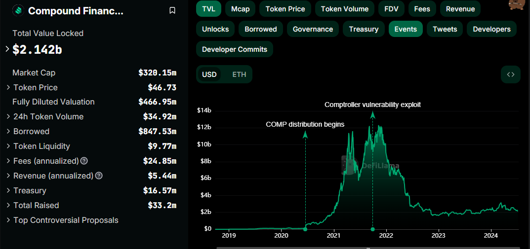 Compound Labs er en av de største DeFi-tjenestene i kryptoindustrien. DeFiLlama data viser at det holder minst 2.14 milliarder dollar verdt av eiendeler fra pressetid.