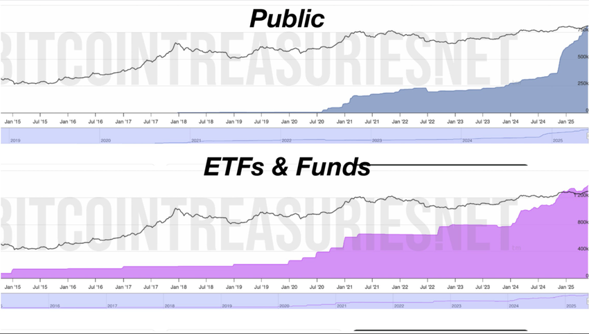 Spesielt stiger Bitcoins institusjonelle beholdning, med BlackRocks ETF som holder over 663 000 BTC. På samme måte samler også MicroStrategy.