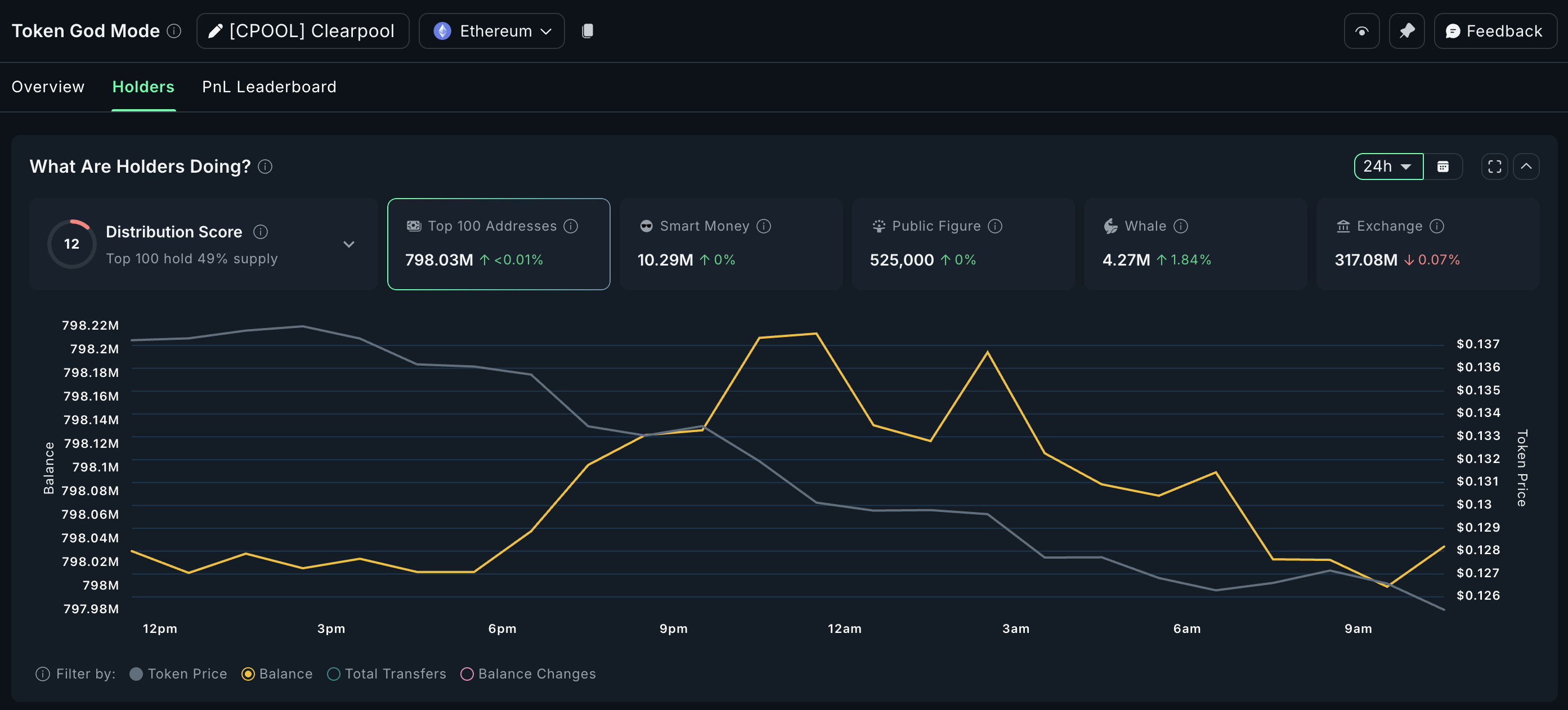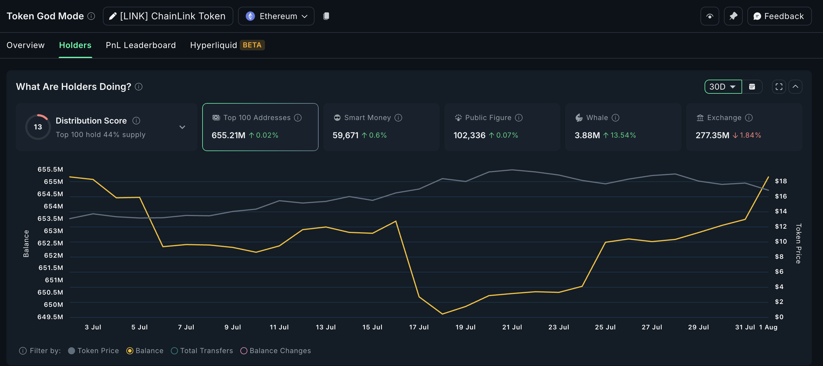 Diagrammet avslører at børsbalansene har falt med 1,84 %. Dette betyr at færre tokens er tilgjengelige for umiddelbart salg. I tillegg reflekterer distribusjonsscoren på 13 en forbedring i tokenfordelingen blant de største holderne.