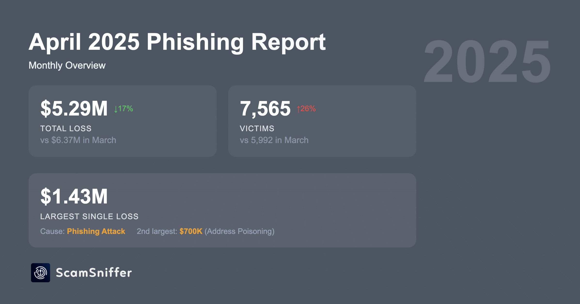 I følge data fra blokkjede-sikkerhetsfirmaet Scam Sniffer, markerer tapene en nedgang på 17 % fra mars’ $ 6,37 millioner. Imidlertid økte antallet ofre med 26 %, med 7565 individer som falt for svindelordninger forrige måned.
