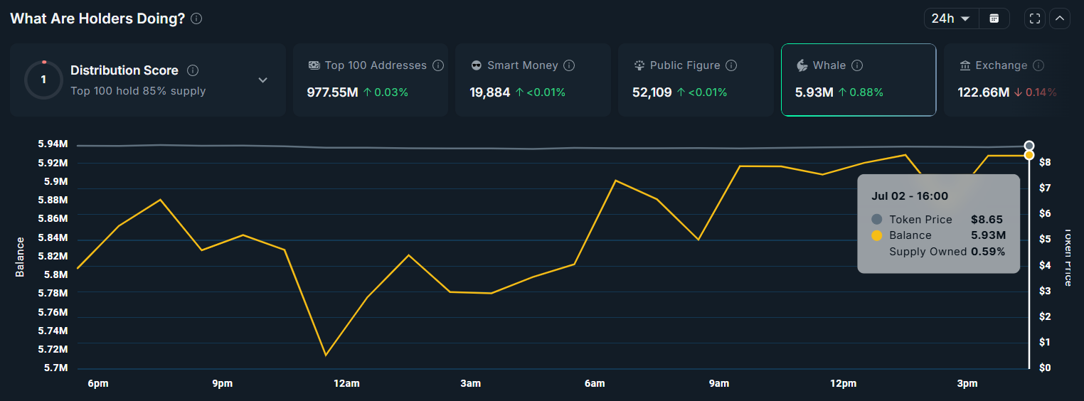 Til tross for sterk hvalakkumulering, falt TRUMPs pris med 3 % de siste 24 timene, og handles nå til $ 8,63. Prisen nærmer seg sin laveste noensinne på $ 7,14, noe som viser at markedsstemningen kan være mer forsiktig til tross for kjøpsaktiviteten fra hvaler.