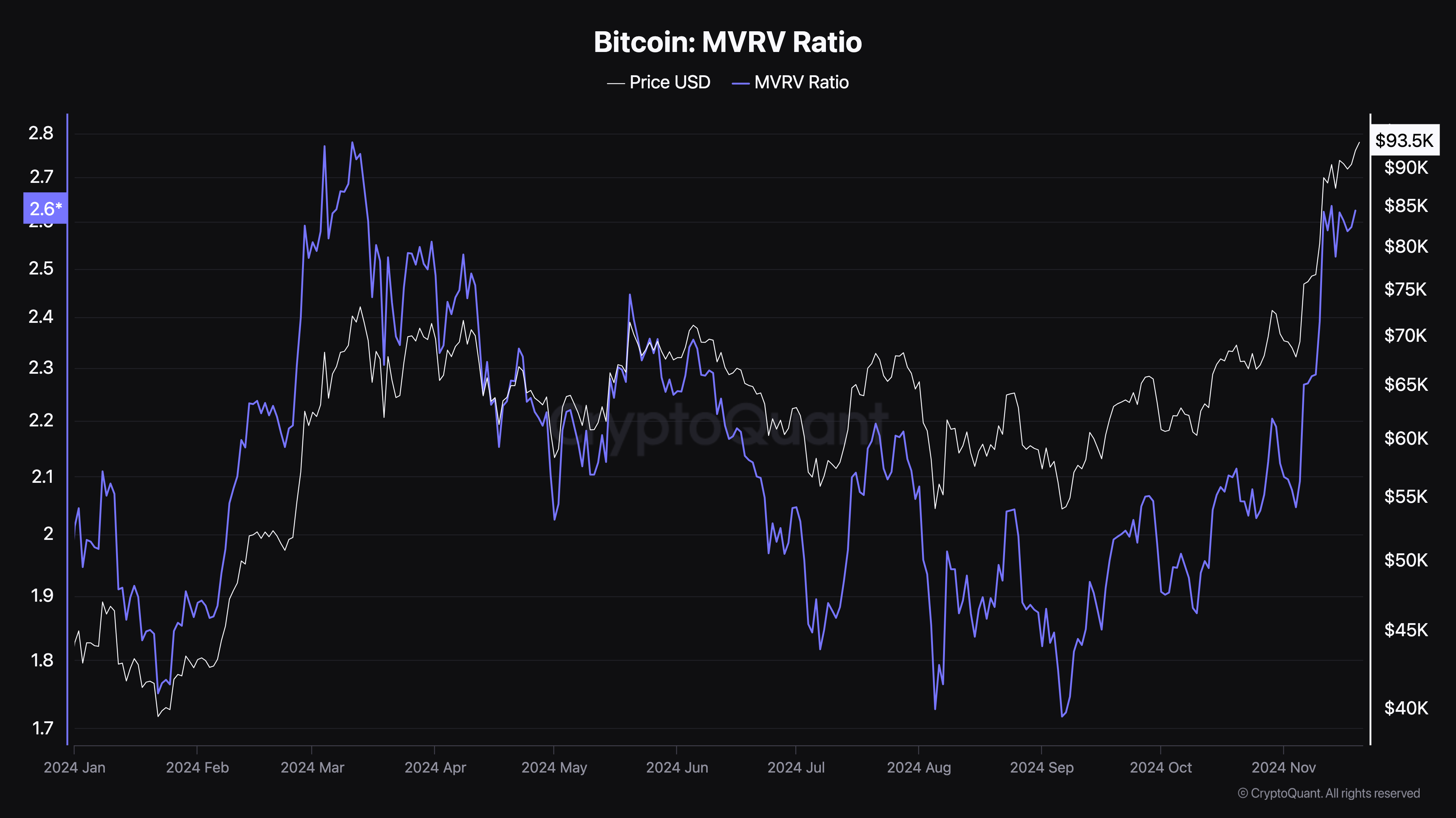 Historisk sett har verdier over 3,7 markert pristopper, som indikerer overvurdering. På den annen side har verdier under 1 indikert prisbunner, som antyder undervurdering. I skrivende stund ligger Bitcoins MVRV ratio på 2,62