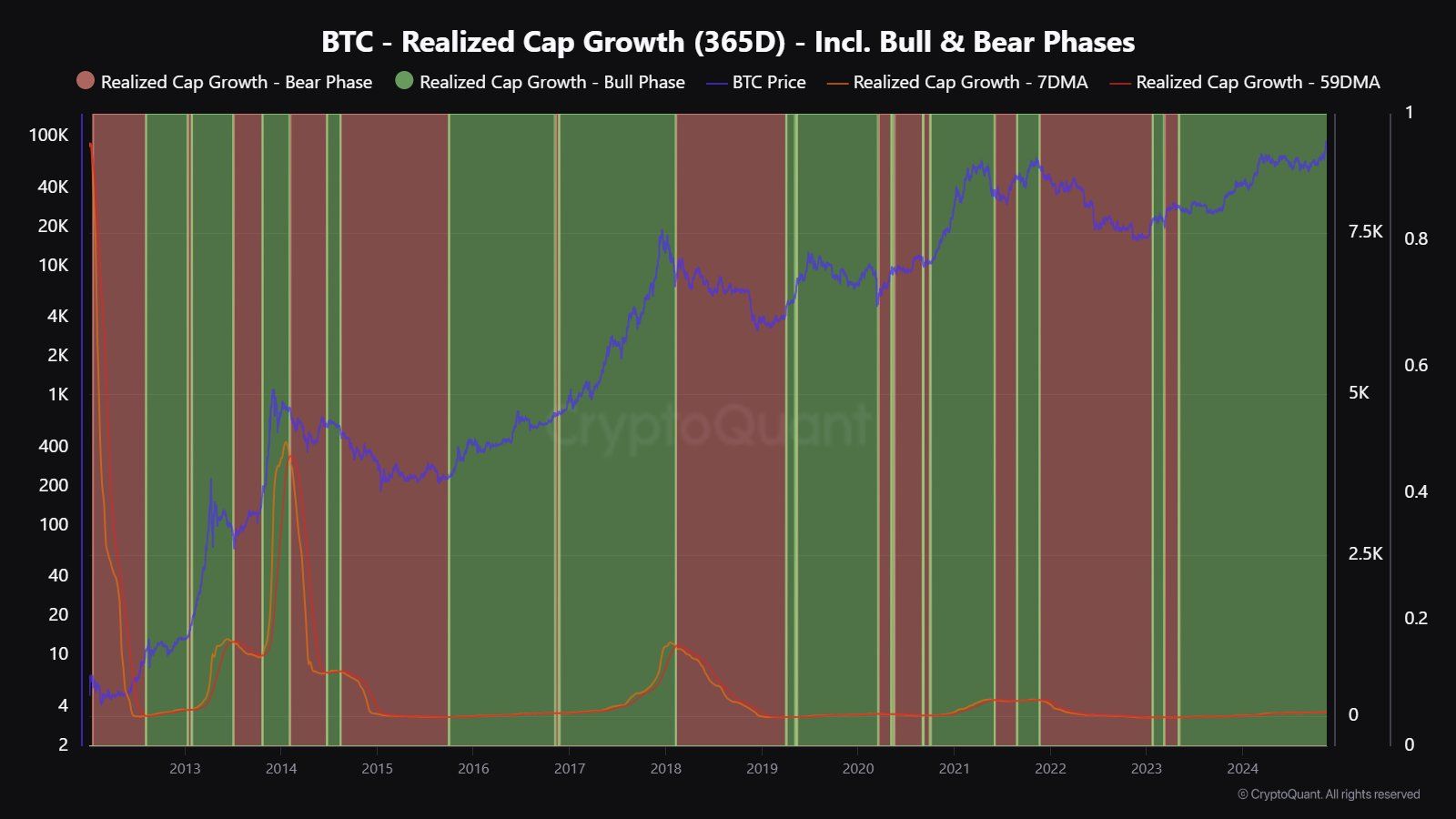 Firmaet understreket også at Bitcoin for tiden mangler ny kapital. Den 365-dagers Realized Cap Growth — en metrikk som brukes til å identifisere bull- og bear-markedsfaser, viste dette.