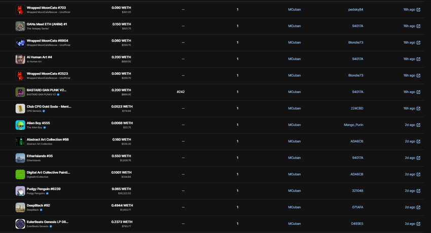 I en bemerkelsesverdig transaksjon solgte cubaneren sin Pudgy Penguins NFT #6329 for 9,065 Ethereum (ETH), tilsvarende nesten $30,000 på salgstidspunktet. I tillegg forsøkte Cuban å selge en NFT med Dallas Mavericks-tema fra Proof of Culture-serien for 15 ETH (omtrent $50,194) gjennom en av OpenSea-lommebøkene sine.