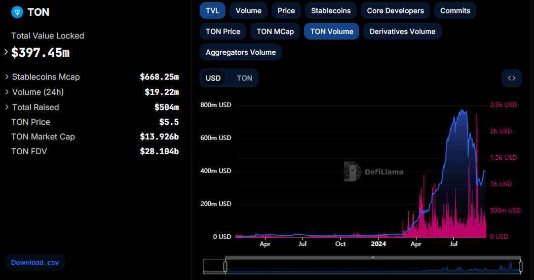 Nylige data viser bemerkelsesverdig vekst innen TON-økosystemet. Den totale verdien låst (TVL) på nettverket nærmer seg $ 400 millioner, en dramatisk økning fra $ 21 millioner i begynnelsen av mars. Integreringen av Tethers USDT har spilt en nøkkelrolle i å øke handelsvolumene og brukeraktiviteten,