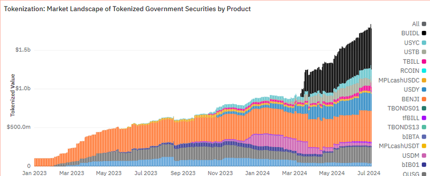 I år har det tokeniserte amerikanske statsobligasjonsmarkedet opplevd enestående vekst. 21.cos data avslører en økning fra 592,63 millioner dollar til 1,78 milliarder dollar hittil i år i den tokeniserte statskassens markedsverdi. Denne veksten på 200 % viser markedets potensial ettersom DeFi-prosjekter og DAO-er i økende grad henvender seg til tokeniserte amerikanske statsobligasjoner.