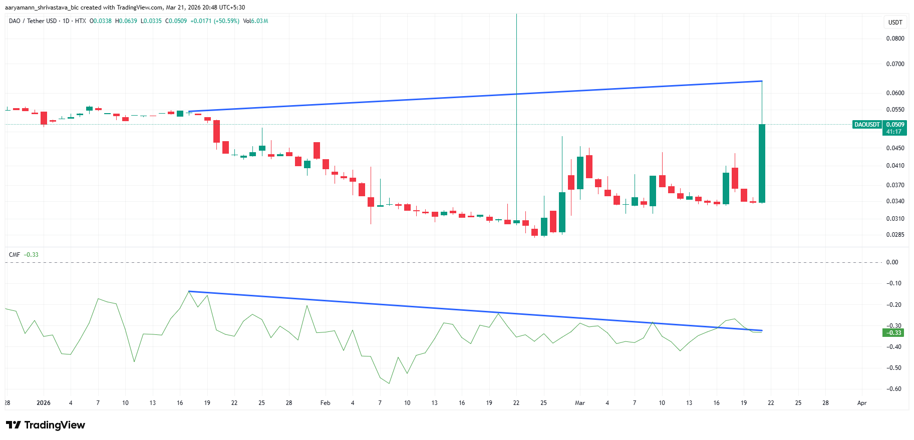 Med hval-lommebøker som har redusert beholdningen med 7 millioner DAO under oppgangen, CMF forankret på -0,33, og kursen allerede på vei ned fra intradag-toppen til $ 0,0505, ligger bevisbyrden hos kjøperne.