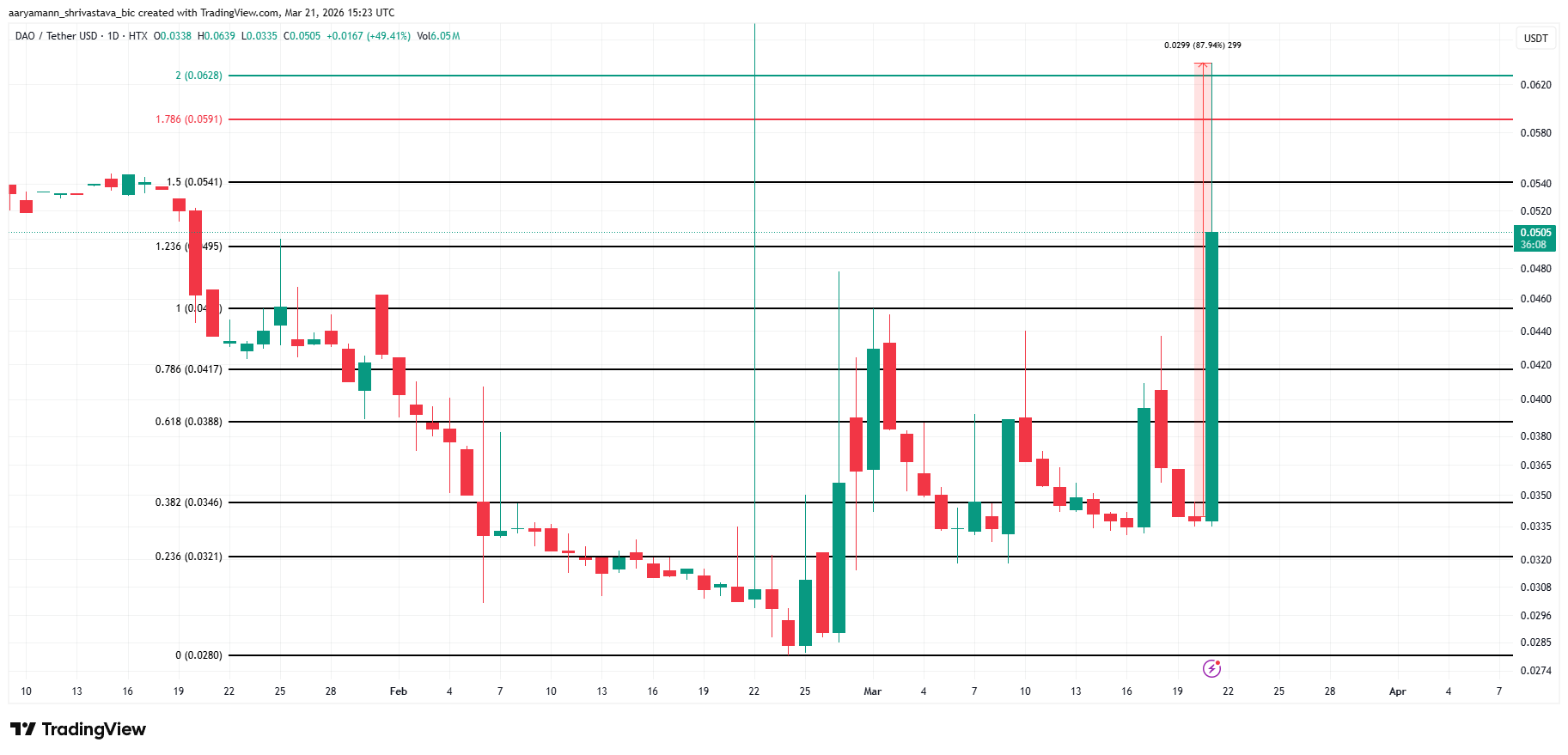 DAO kurs på $ 0,0505 ligger mellom 1,236 Fibonacci-nivået ved $ 0,0495 og 1,5-nivået ved $ 0,0541. Intra-dag toppen på $ 0,0639 var kort innom 2,0-forlengelsen ved $ 0,0628, og markerte en oppgang på 88 % før den ble avvist.