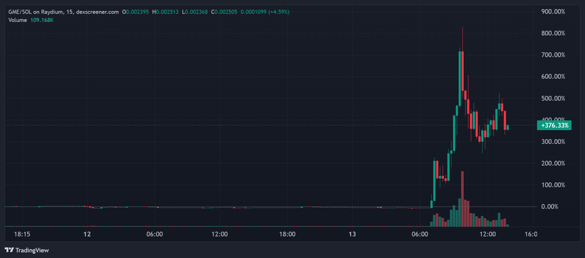 I tillegg til å drive KITTYs pris, påvirket Gills comeback en annen mememynt, GameStop (GME). I skrivende stund så GME en økning på omtrent 376 % i 15-minutters tidsrammer.