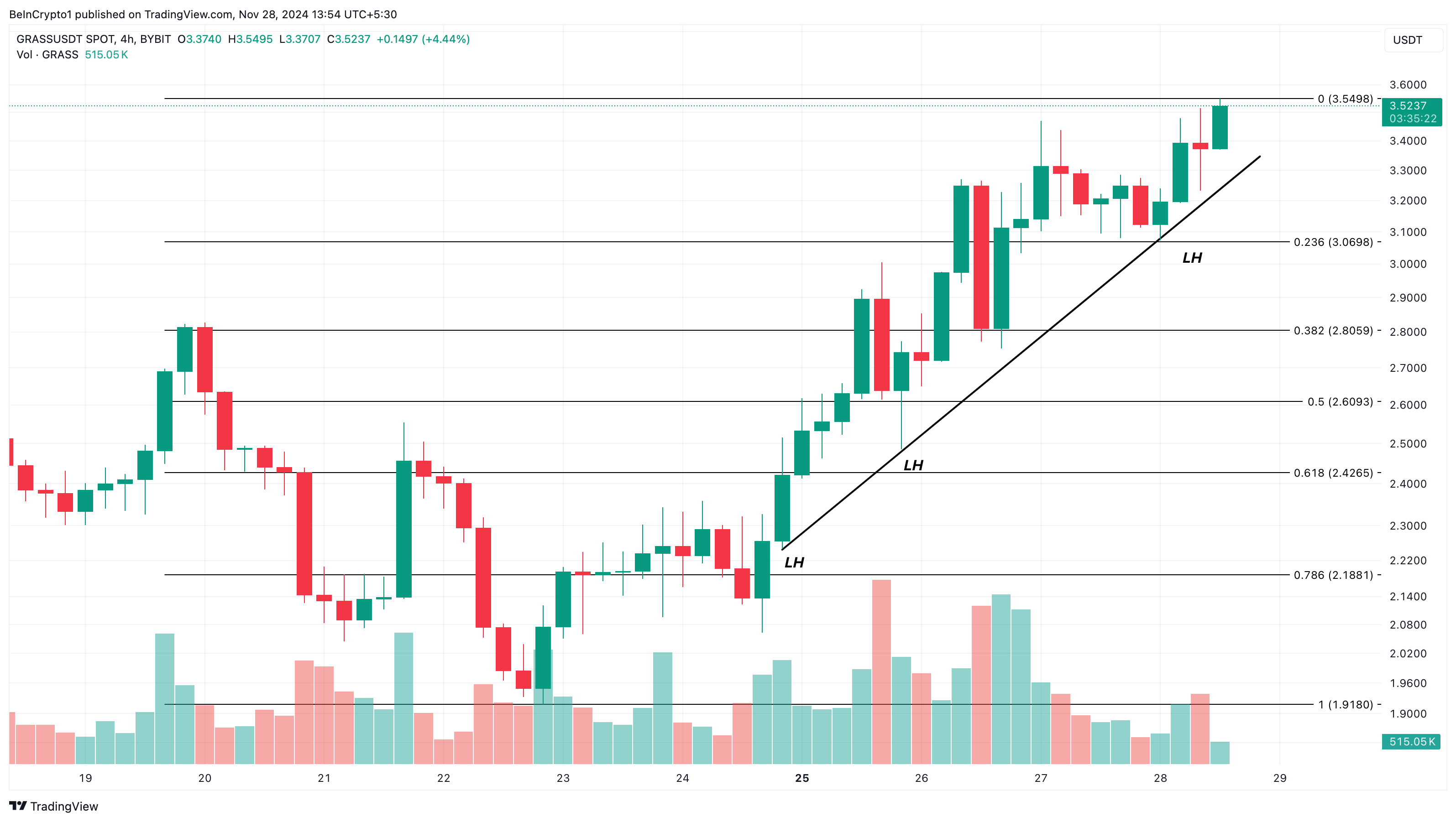 For øyeblikket er GRASS’ pris $ 3,48 og har nådd lavere topper (LH) på 4-timers diagrammet. På grunn av denne prisbevegelsen kan altcoinens verdi sannsynligvis nå en ny all-time high i desember, og overstige $ 3,90 i prosessen.