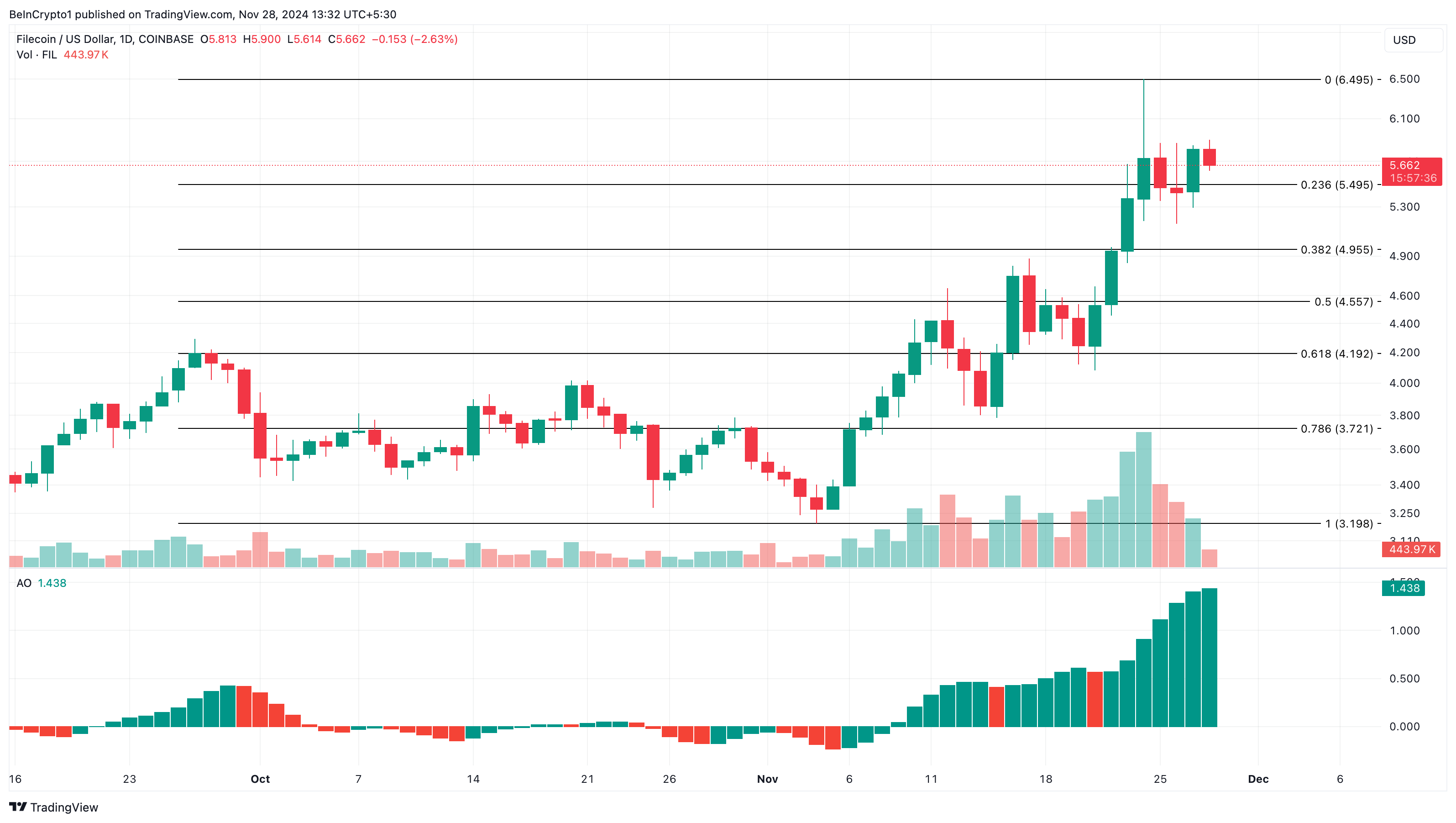 Men når den er positiv, er den bullish, noe som er tilfelle med FIL. Hvis dette forblir tilfelle, kan altcoinens pris stige til $ 6,50 i løpet av de første dagene i desember. Men hvis momentumet blir bearish, kan det hende at dette ikke skjer, og Filecoin kan falle til $ 4,96.