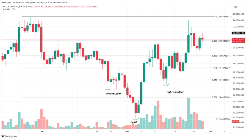 Dette mønsteret er en bearish til bullish reversering som ble bekreftet etter at AR bunnet ut på $ 133. Imidlertid møter tokenen for øyeblikket motstand på $ 22,05, men kan hjelpe AR med å bryte denne hindringen.