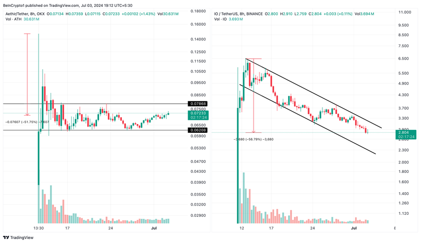 Mer enn 20 dager etter deres etterlengtede tokenoppføringer, har to fremtredende desentraliserte fysiske infrastrukturnettverk (DePin) prosjekter, Aethir (ATH) og io.net (IO), sett markedsverdiene falle med mer enn halvparten.