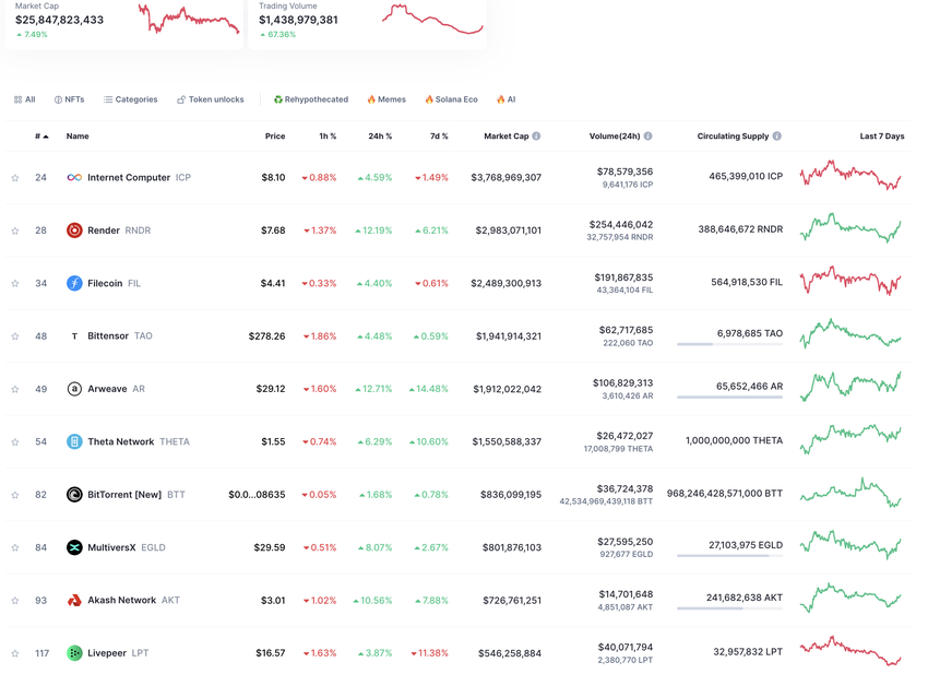 I følge CoinMarketCap har DePin-sektoren økt med 7,49 % de siste 24 timene. Den totale markedsverdien er nå på 25,8 milliarder dollar.