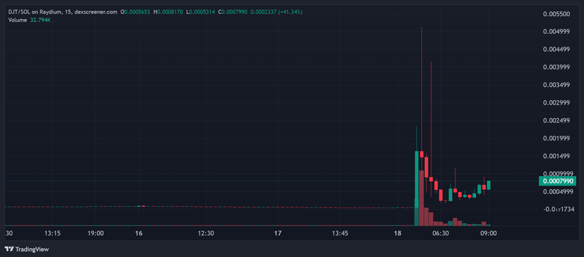 DJT, en ny meme-mynt på Solana (SOL), ser en økning i handelsaktivitet og en massiv pristopp etter et rykte om at tokenet er et offisielt kryptotoken fra tidligere amerikanske president Donald Trump.
