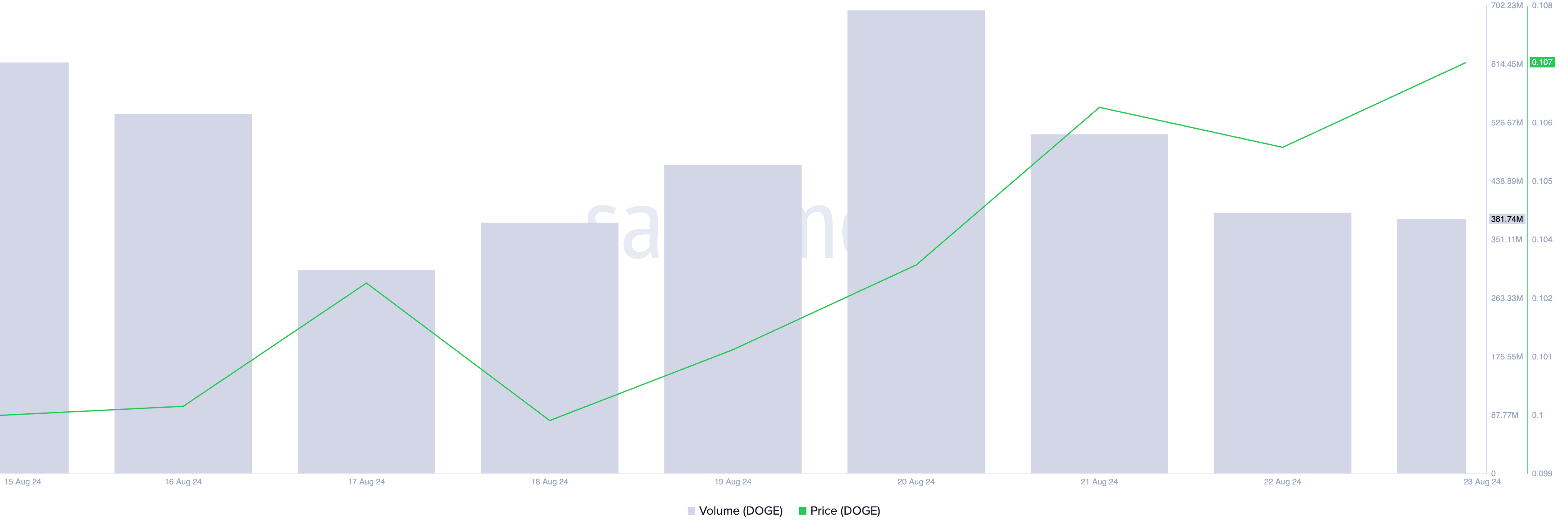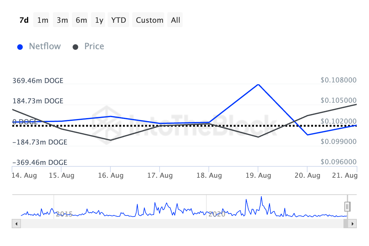 Siden 8. august har DOGE møtt motstand ved $ 0.10 og funnet støtte ved $ 0.09. Den nylige oppgangen mot motstandslinjen har blitt drevet av en prisøkning på 4 % de siste syv dagene.