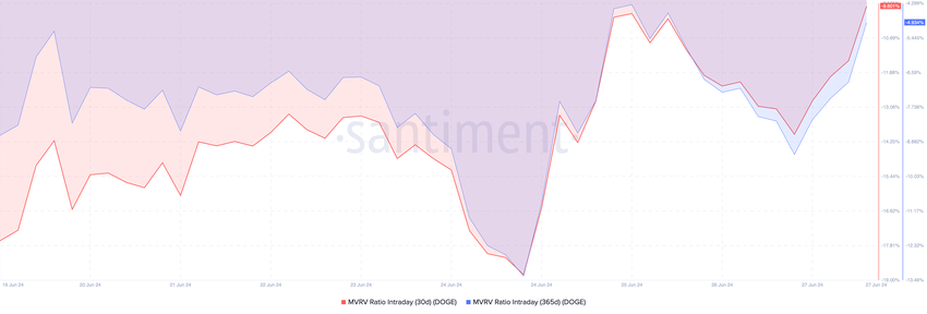 DOGEs MVRV-forhold, basert på 30-dagers og 365-dagers glidende gjennomsnitt, er henholdsvis -9,6 % og -4,93 % i skrivende stund.