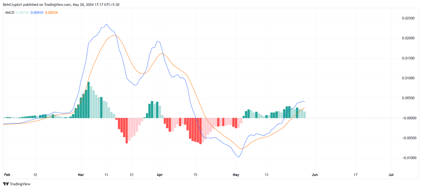 Sammen med dem, til tross for den nylige dukkert, observerer DOGE bullish signaler. Moving Average Convergence Divergence (MACD) viser det samme. MACD (Moving Average Convergence Divergence) er et teknisk analyseverktøy som viser forholdet mellom to glidende gjennomsnitt av et verdipapirs pris.