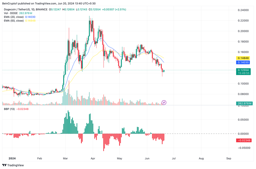 Nedgangen i DOGEs verdi førte til at prisen falt under 20-dagers eksponentielt glidende gjennomsnitt (EMA) og 50-dagers lite glidende gjennomsnitt (SMA) den 7. juni.