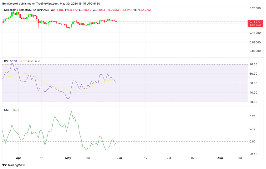 På samme måte var Chaikin Money Flow (CMF), som sporer hvordan penger strømmer inn og ut av en eiendel, under null på -0,01. Denne verdien viste økt likviditetsutgang fra DOGEs marked av investorene.
