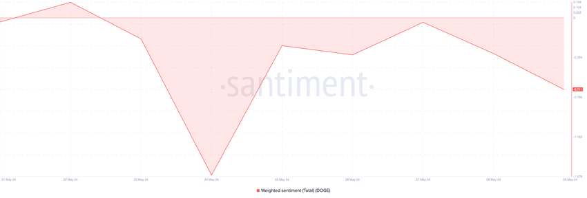 Den negative stemningen som har fulgt DOGE det meste av måneden, kan være grunnen til at få adresser handler den. DOGEs vektede sentiment var fortsatt negativt ved pressetidspunktet, og var -0,71.