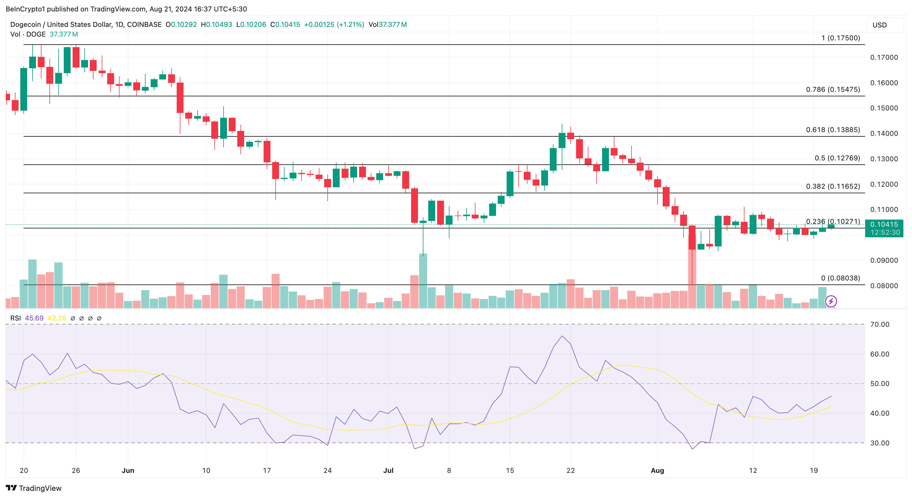 Et blikk på Fibonacci retracement-nivåene gir mer innsikt i prognosen. Typisk identifiserer indikatoren prisnivåer en krypto kan nå. I skrivende stund svever DOGE rundt $ 0,10 tilbaketrekkningsområdet der 23,6 % Fib-nivået posisjonerer. Hvis markedsforholdene forblir de samme, kan prisen mislykkes i å heve seg utover dette punktet.