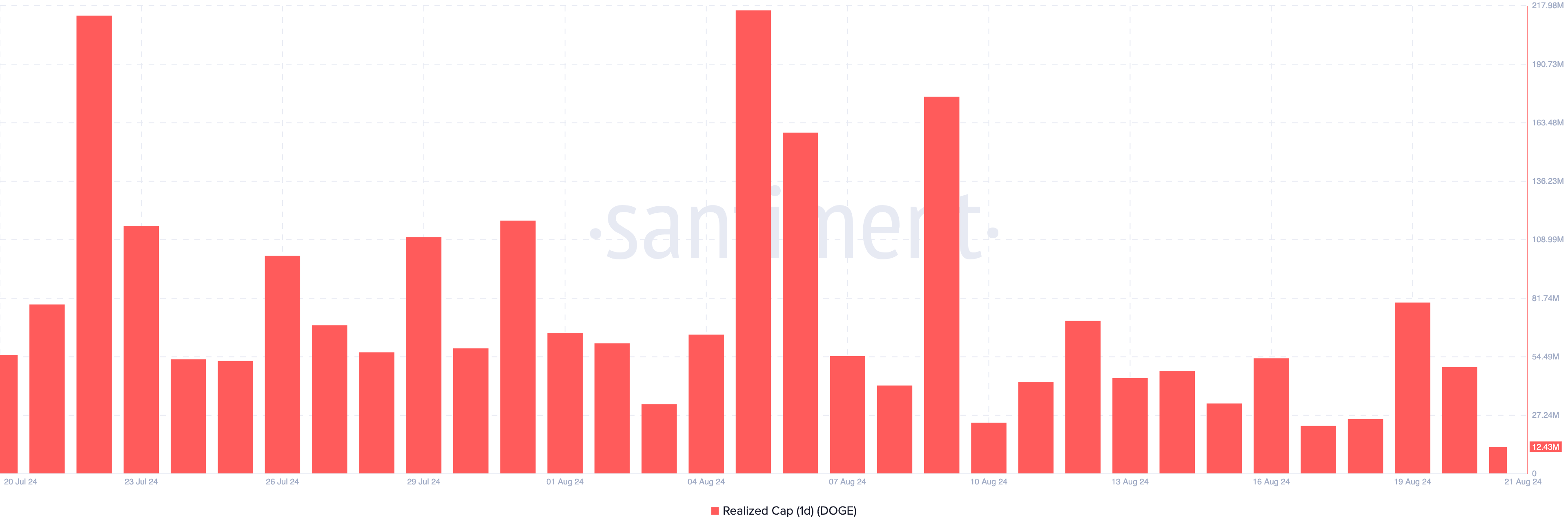 Data fra Santiment viser at Dogecoins en-dags realiserte kapital har nådd en månedlig lav på $ 12,43 millioner. Som en kort form for realisert kapitalisering, fungerer denne metrikken som en samlet kostnadsbasis for mynter på en blokkjede.
