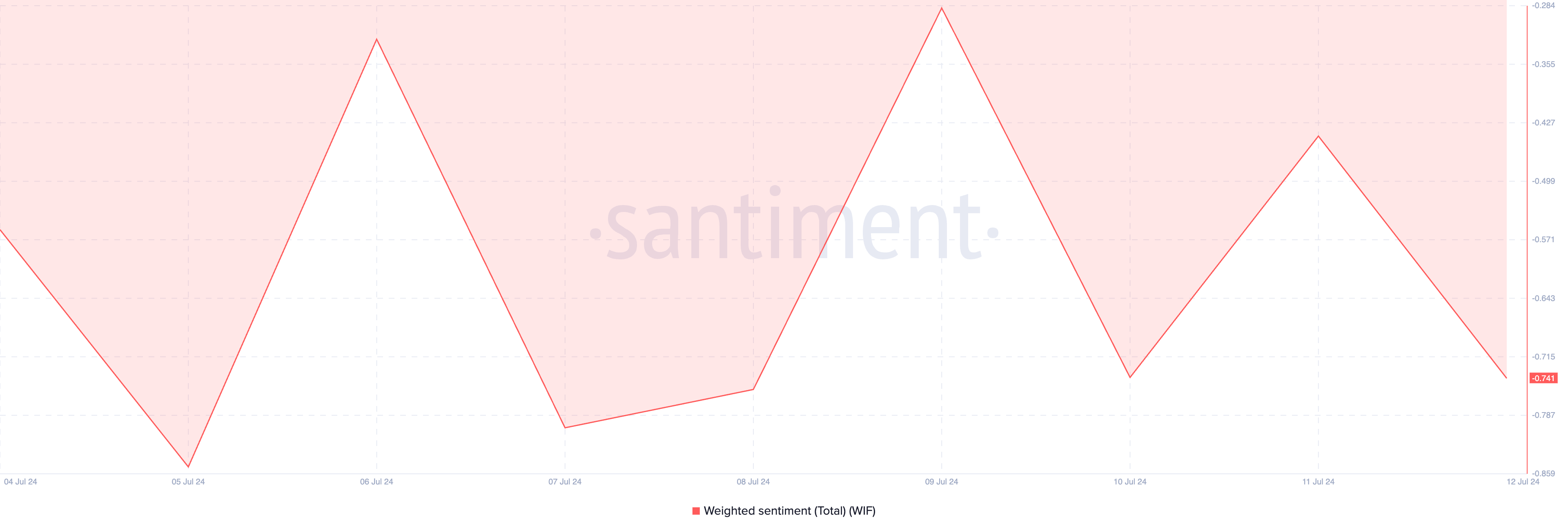 Videre forble meme-mynten plaget av bearish følelser. Når dette skrives, er det vektede sentimentet negativt på -0,74.