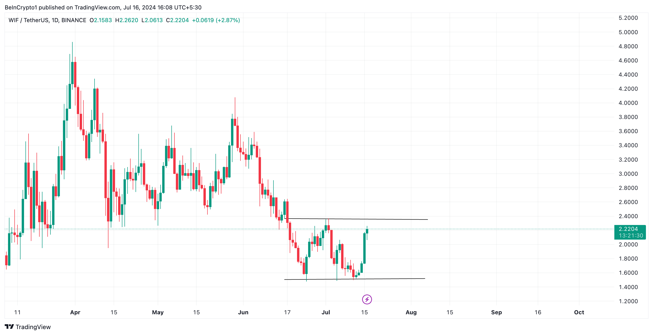 I WIFs tilfelle har det blitt dannet motstand på prisnivået $2,36 og støtte på $1,51. Prisoppgangen den siste uken har presset meme-mynten mot den øvre linjen.