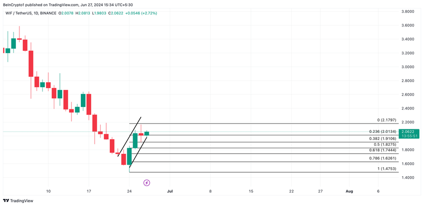 Dogwifhat (WIF) stupte til et hittil i år (YTD) lavpunkt på $1,82 den 25. juni. Prisen har siden steget med 13% til handel på $ 2,05 på pressetidspunktet.