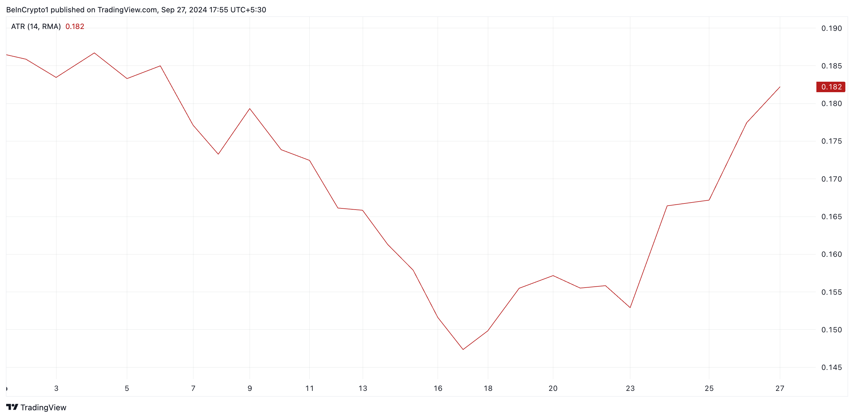 WIFs stigende gjennomsnittlige sanne rekkevidde (ATR), som måler volatiliteten over en spesifisert periode, styrker den ovennevnte posisjonen. Indikatoren har vært i en oppadgående trend siden 17. september og er på 0,18 i skrivende stund.