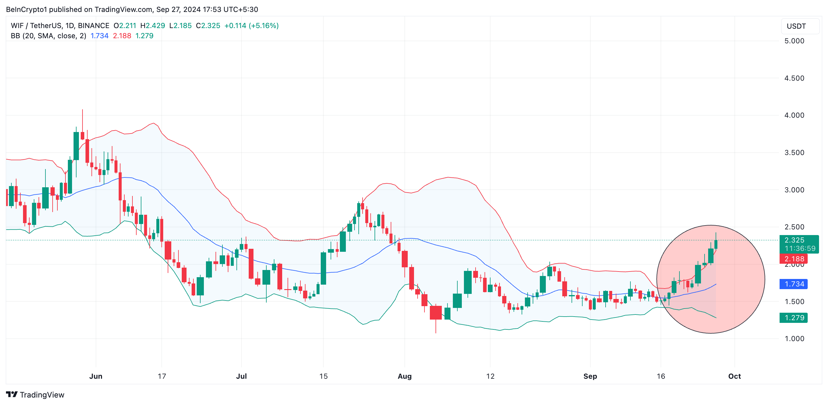 Dogwifhats tosifrede prisøkning har vært ledsaget av en merkbar økning i markedsvolatiliteten, som bevises av den økende avstanden mellom dens Bollinger Bands-indikator.