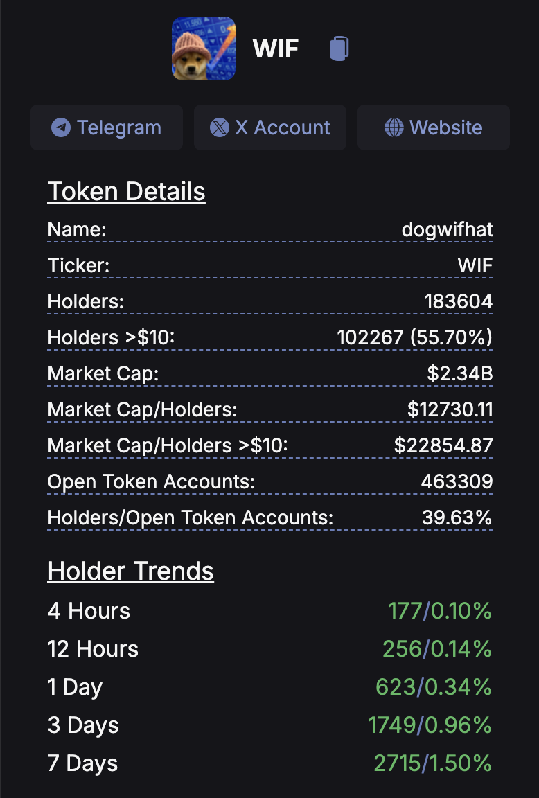 I tillegg reiser det lave volumet av ny etterspørsel etter WIF den siste uken tvil om bærekraften til den nåværende oppadgående trenden. Data fra holderscan.com viser at bare 2 715 nye WIF-innehavere, en økning på bare 1,50 % i antall nye innehavere, har blitt lagt til de siste syv dagene.