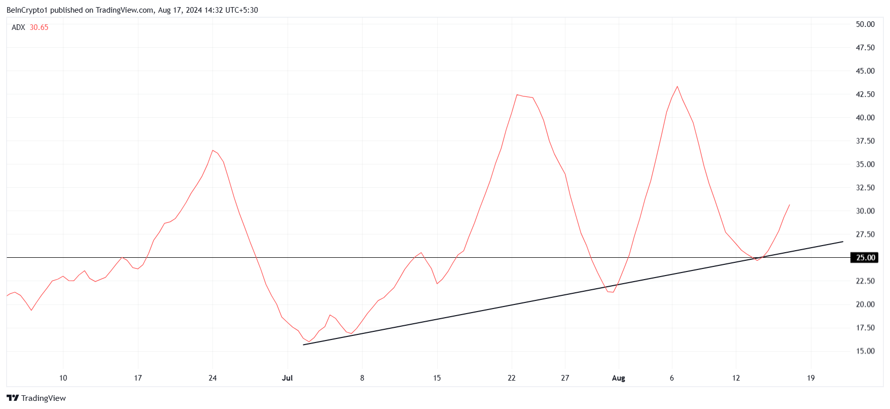 Imens peker ADX (Average Directional Index) på en styrkende makrotrend, som viser seg å være bearish. Indikatoren er for øyeblikket over den kritiske terskelen på 25,0, noe som signaliserer at nedtrenden får fart.