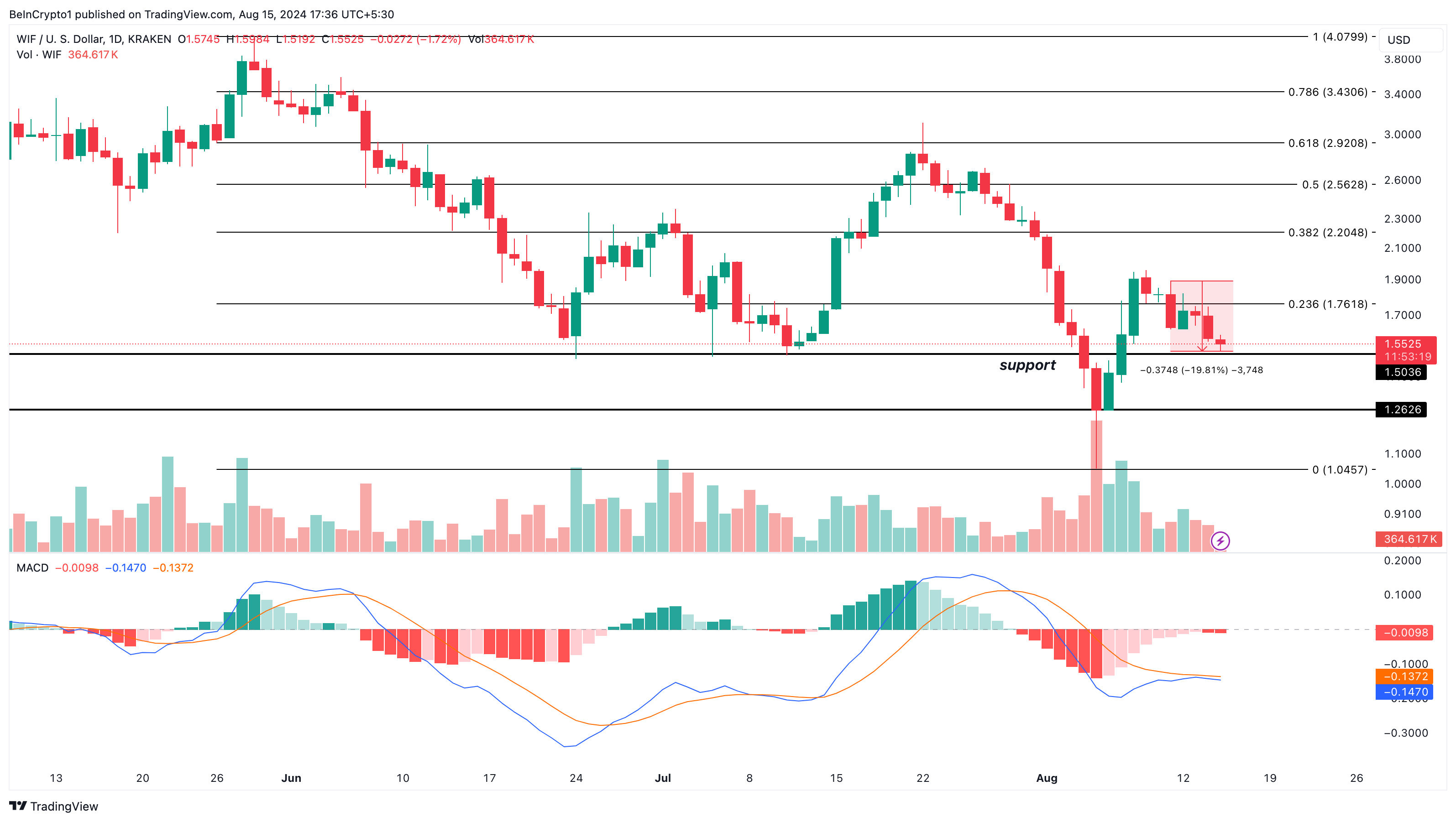 På det daglige diagrammet intensiverte WIFs nedgang etter et bearish engulfing lys den 11. august, noe som resulterte i et fall på 19,81 % over fire dager. En nærmere analyse avslører et nøkkel støttenivå på $ 1,50.