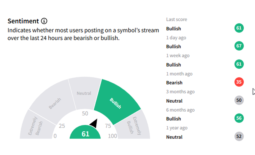 Pro-tips: Når prisene er i en nedadgående trend, men Stocktwits’ stemnings- og meldingsvolumskår stiger, er det ofte en kraftig ledende indikator på at en bunn er nådd eller er i ferd med å utvikle seg veldig snart.